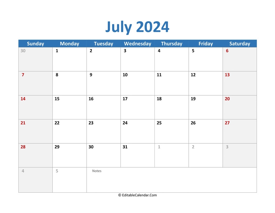 July 2024 Monthly Calendar Printable