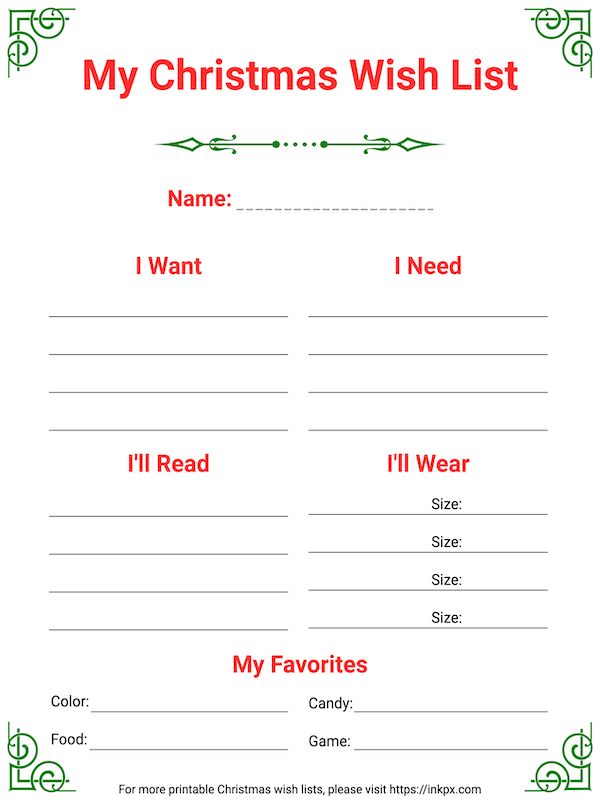 Free Printable Fancy Corner Christmas Wish List Template InkPx
