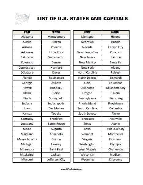 50 States And Capitals List Free Printable50 States And Capitals List Free Printable