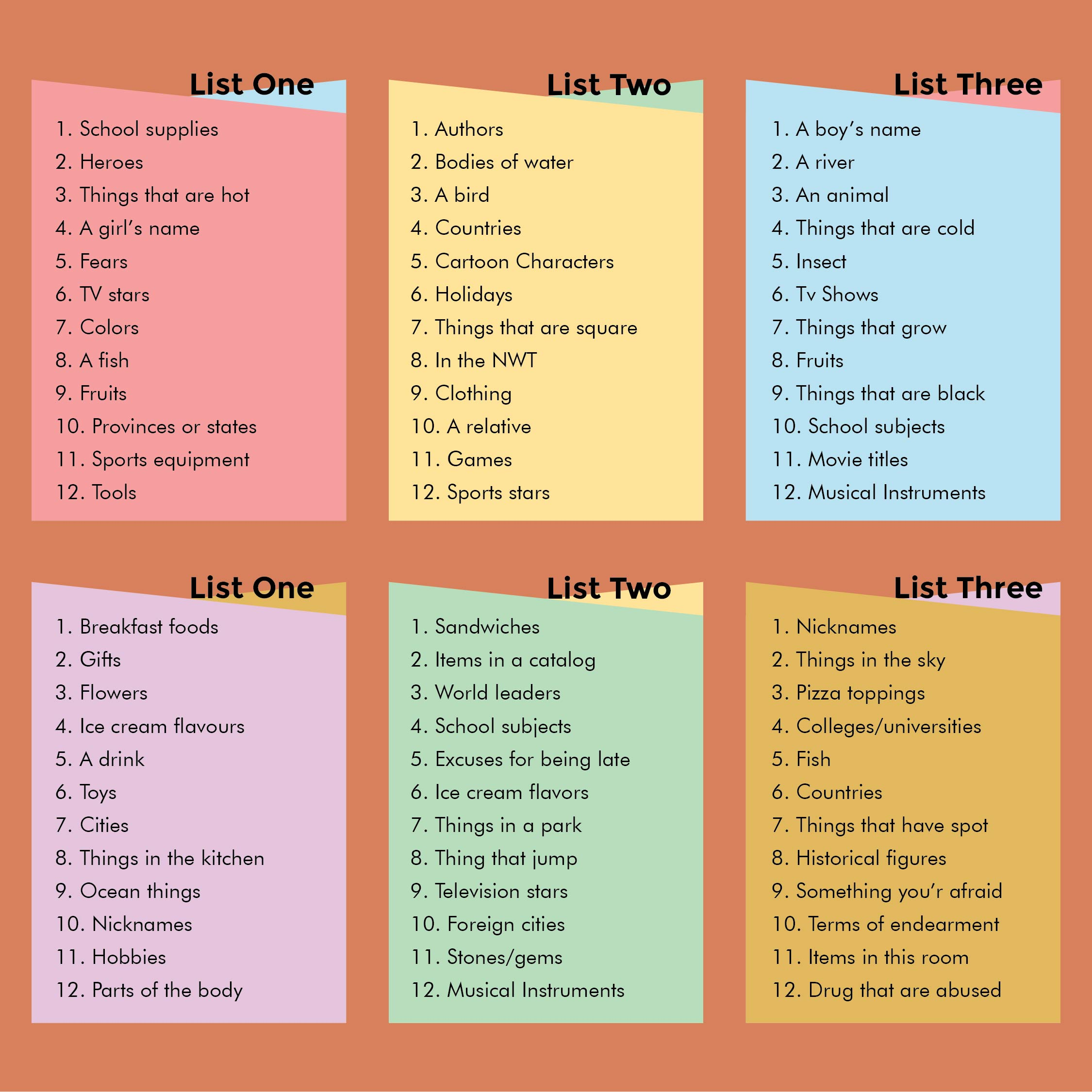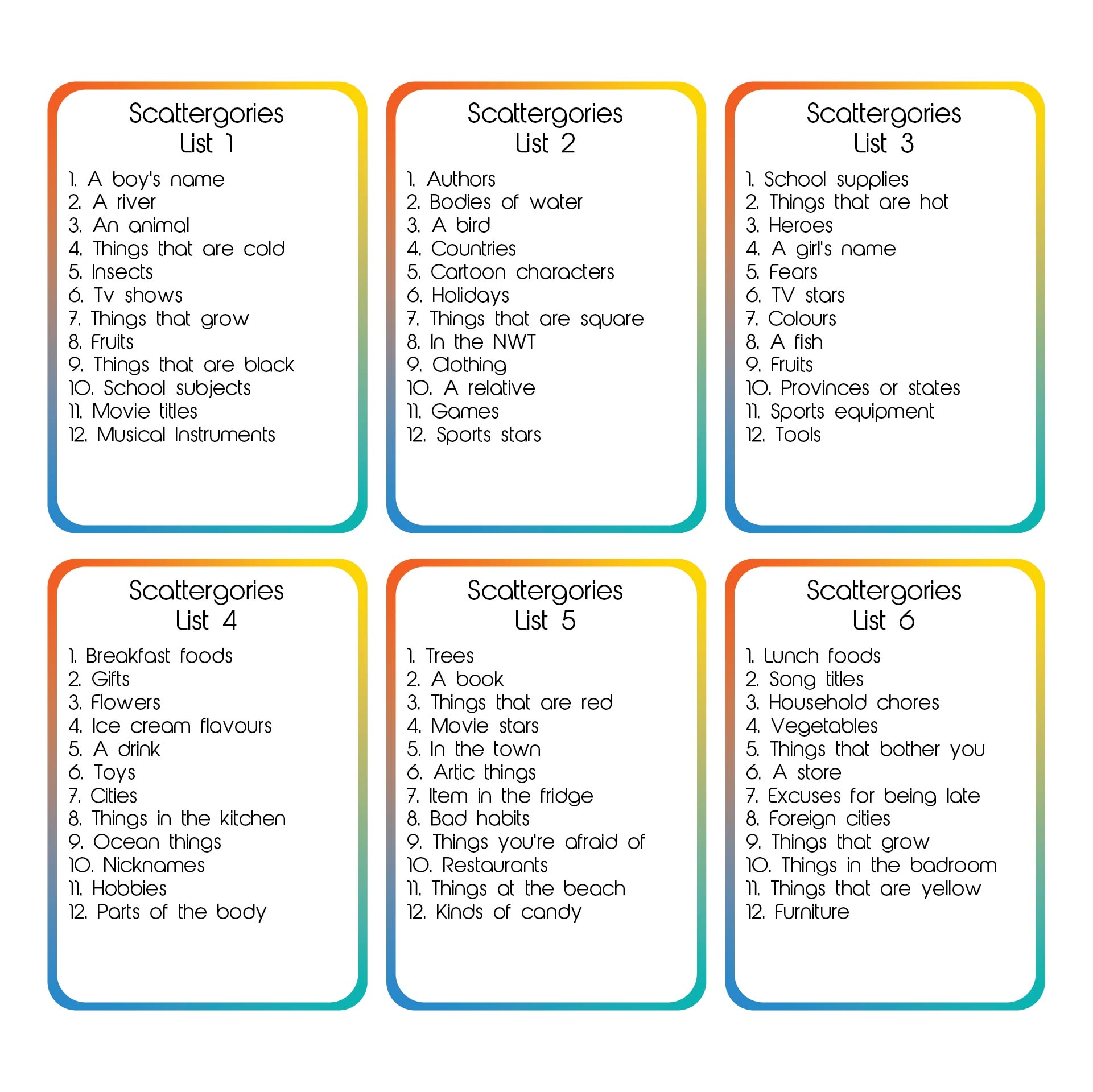 Download and Print Scattergories Printable Lists