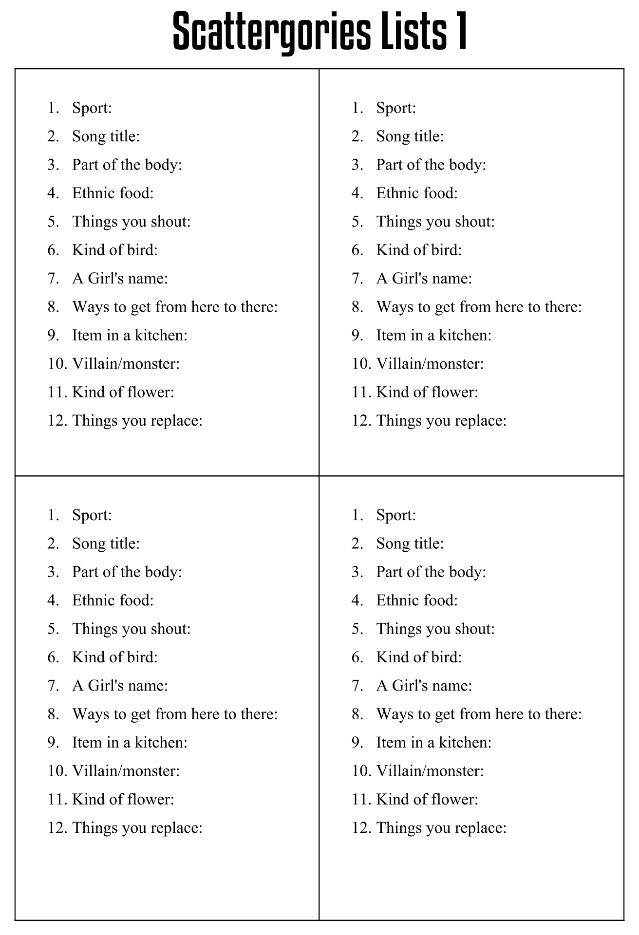 Free Scattergories Printable Lists are pre-designed documents available in formats like Picture, Jpeg. You can download, print, and customize them Scattergories Printable Lists for any use—be it work, study, or personal planning. They cater to a broad variety of needs—from daily planners and budget trackers to resumes and greeting cards.