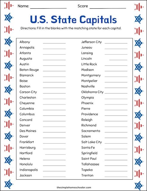 State Capitals Printable List